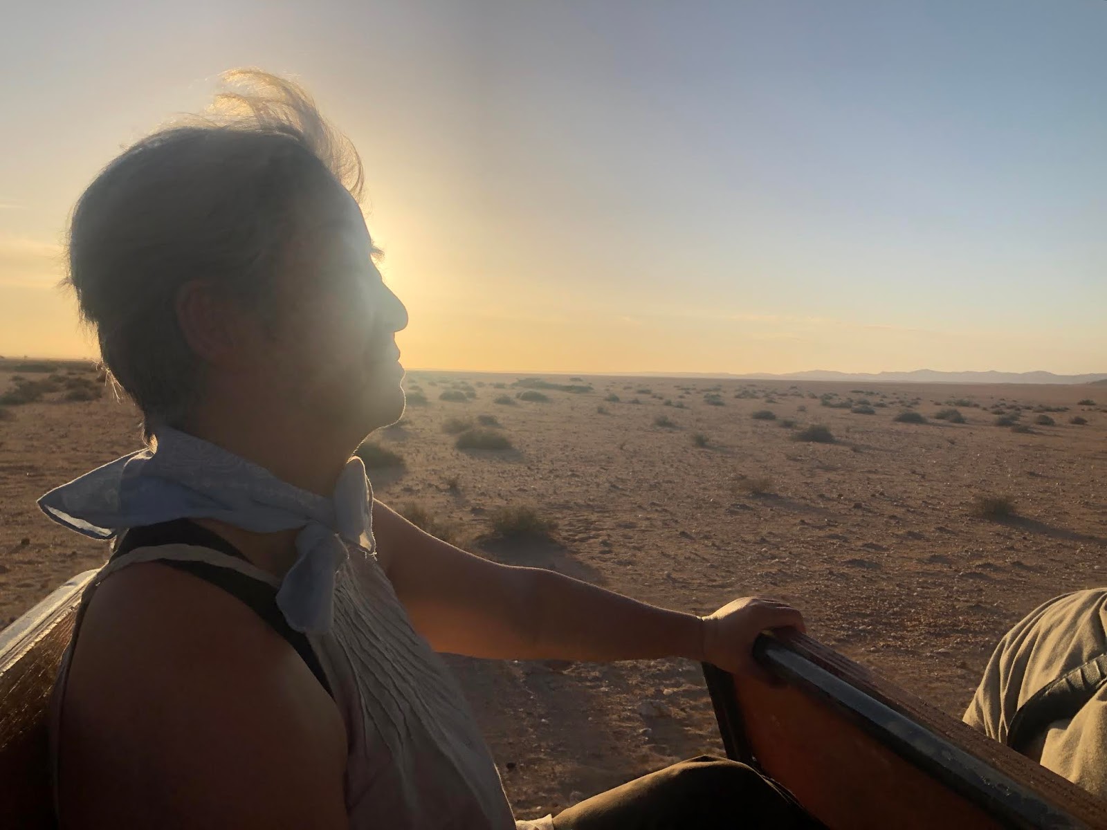 He could identify different insect specials, all animals tracks, spider traps & webs, all types of feces, nests, hiding spots, snake movements... Franz explained the history of Namibia, the history of his language and how the Namib desert came to be. There wasn’t anything he didn’t know about the strong winds, the the heat, the safest place to remain cool, how to find water and how to avoid being bitten by a snake. Takako in the Sand Truck, as the sun is going down. He knew exactly what every animal and plant needed to survive and how long a human could be in the heat for without water.