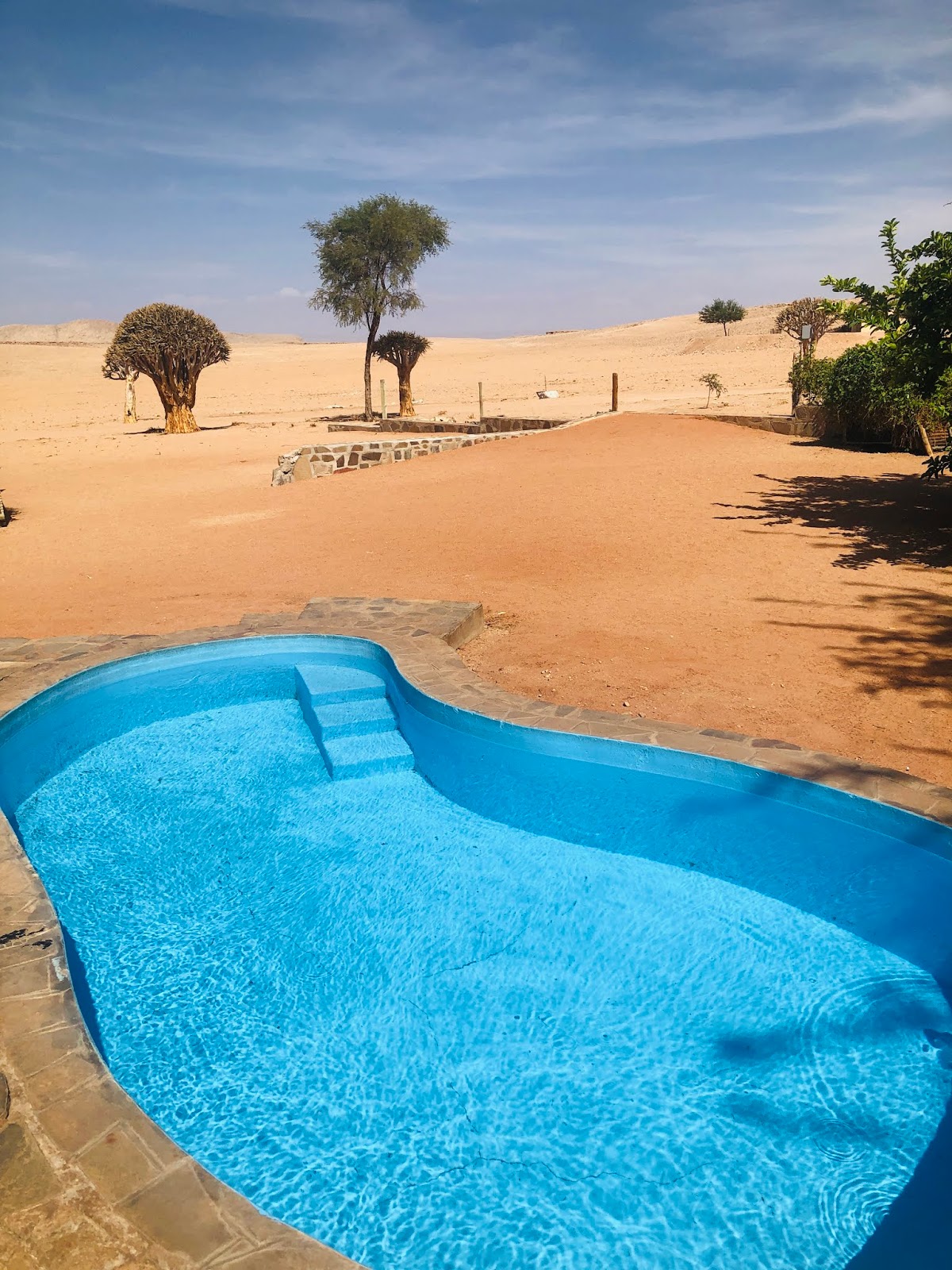 Solitaire is known for it’s amazing pies... and apparently they were delicious... but I didn’t indulge. It was one of those places with fabulous (and temporary) wi-fi, so it was a good opportunity to get on line, albeit a short time. If the wi-fi hadn’t been working, there was the temptation of visiting the Solitaire Activity Centre. I envision a big room filled with locals... all doing their own thing. No team sports or activities in Solitaire. After our lunch stop there, we continued along another bumpy, dusty road, to yet, another remote place in the uninhabited desert. Just when you think that you can’t get more in to the desert, there you are... in a more isolated place of the world, with the scorching & unbearable heat beating down on us. Boesman’s Camp. Lucky us... there was a tiny little pool to cool off... abut half the size of my living room. Smaller, actually. The slide leading in to the pool is a pending lawsuit. Metal, broken, boiling hot, dangerous... I met Takaka walking down to the pool and made sure that I warned her how big it was. “Enormous,” I said. “Whaaaaaaaaat?” We have all now adopted this saying for whenever anything happens... anything at all. I fear it may be a time before we are able to drop this bad habit. **Important announcement** We have all come to know the two Korean boys, Park and Yu, as... Wait for it... Wait for it... Park You! And it never gets old.