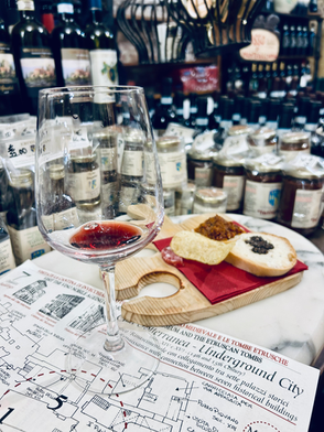 We spent about an hour wandering uphill through the winding streets. Our first stop was a shop with an old Etruscan tomb to explore... and we finished with a wine tasting and some (not so vegetarian) treats. Had we been meat-eaters, the spread would have been impressive and could have easily replaced lunch. Sheeses, salami, truffle cream cheese on bread, ground beef with sundried tomatoes, crisps... and honestly, so much more than one would expect at the end of a free tomb tour!